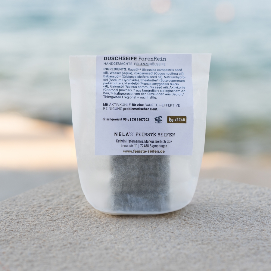 Erlebe eine porentiefe Reinigung und intensive Pflege mit unserer PorenRein Duschseife! Speziell entwickelt für fettige und zu Akne neigende Haut, kombiniert diese handgemachte Seife die entgiftenden Eigenschaften von Aktivkohle mit wertvollen Pflanzenölen – für ein reines und gepflegtes Hautgefühl.