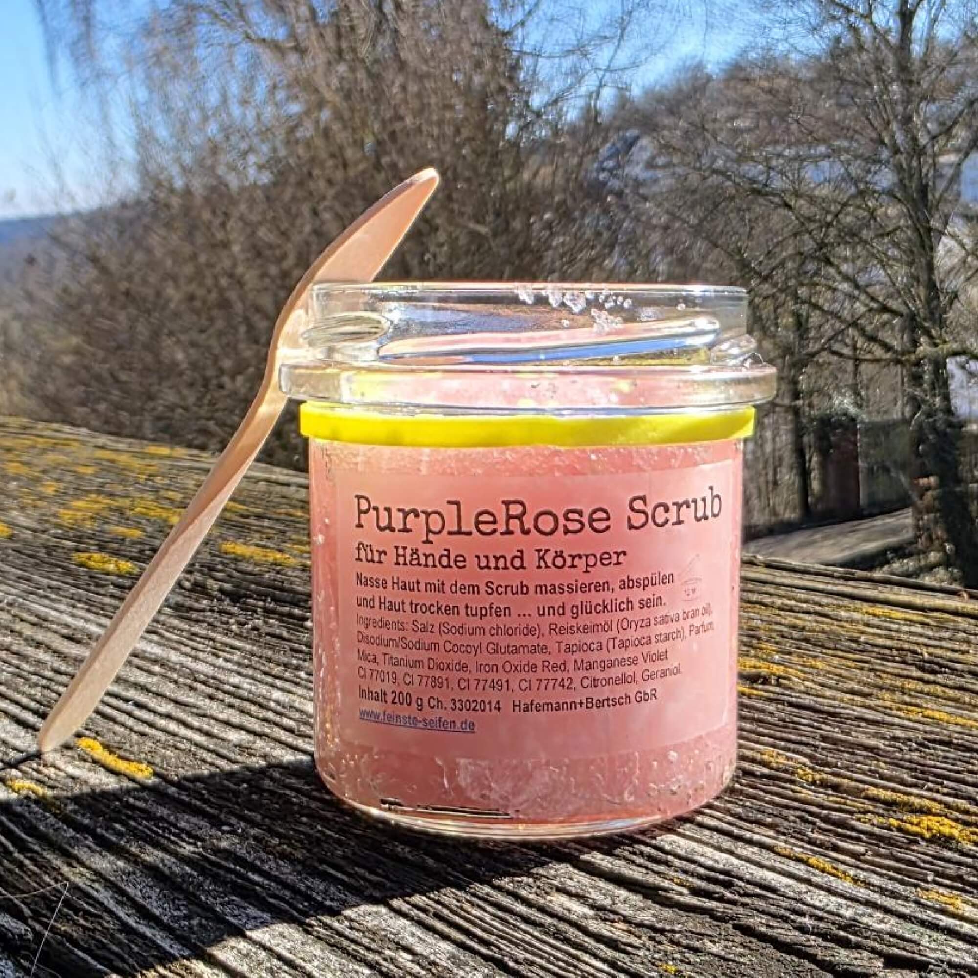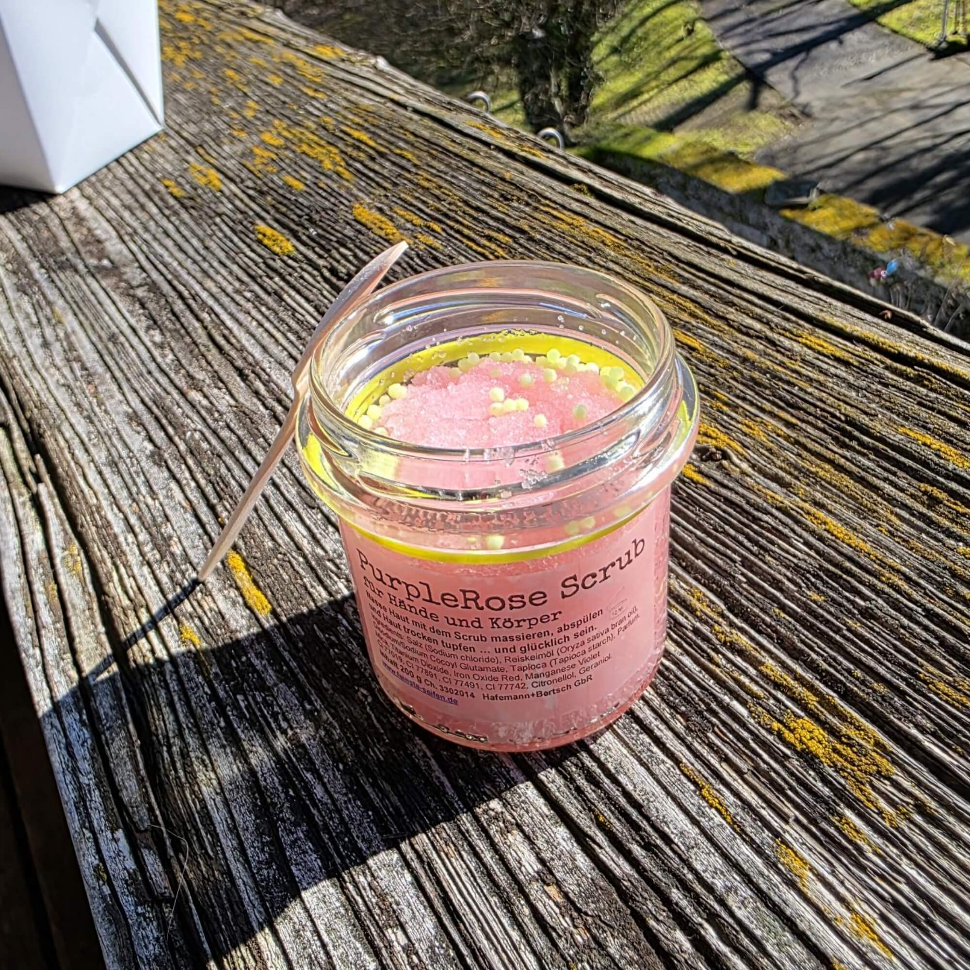 Mineralische Pigmente wie Mica, Titandioxid, Eisenoxid und Manganviolett – sie sorgen für die charakteristische violett-rosige Farbe des Scrubs. Diese Farbstoffe sind in der Naturkosmetik zugelassen und werden für ihre gute Hautverträglichkeit geschätzt.