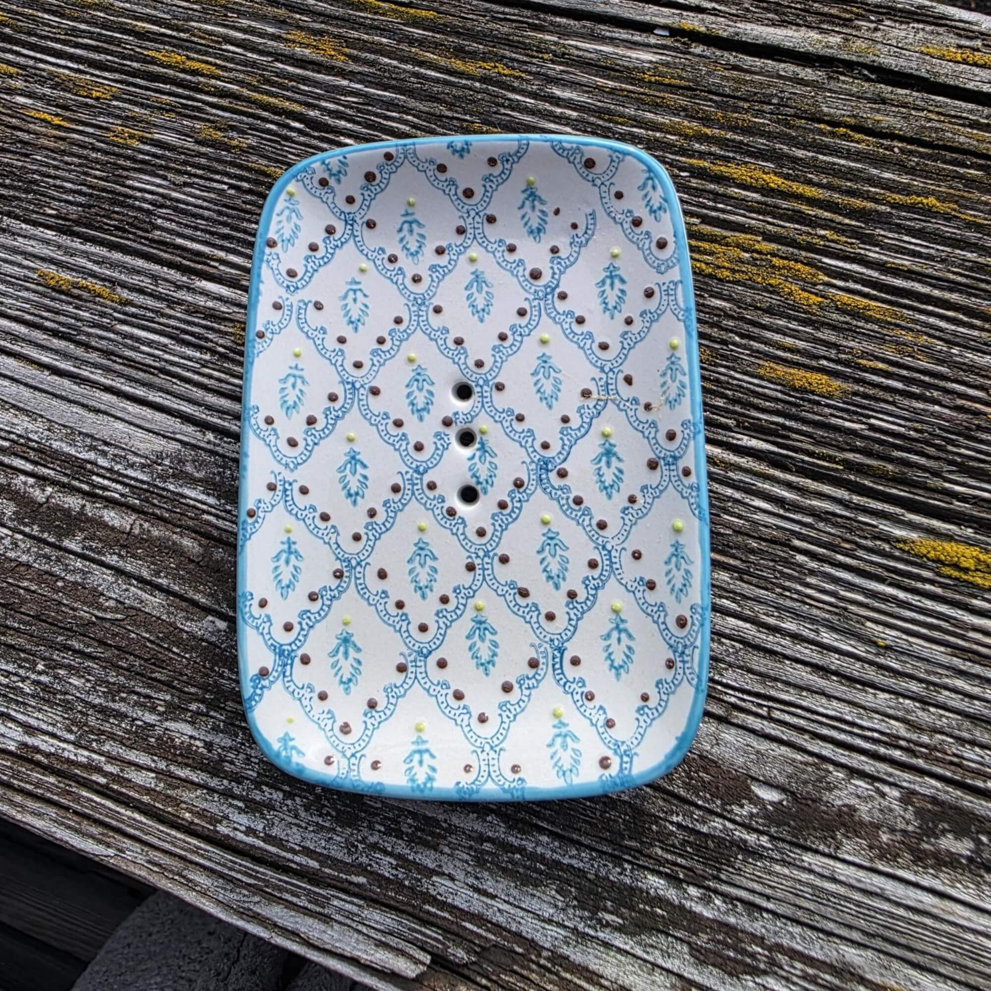 Diese hübsche Seifenschale steht für Klarheit und Ruhe. Die rechteckige Keramik-Seifenschale zeigt ein fein gearbeitetes, ornamentales Muster in hellem Blau und Weiß – grafisch, ausgewogen und angenehm zurückhaltend. Das Design erinnert an klassische Kachelmuster und bringt eine ruhige Ordnung an dein Waschbecken.