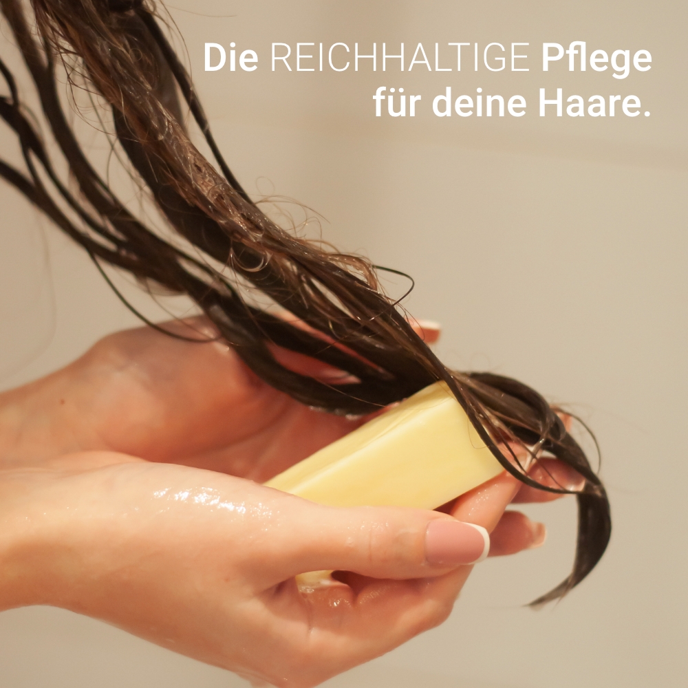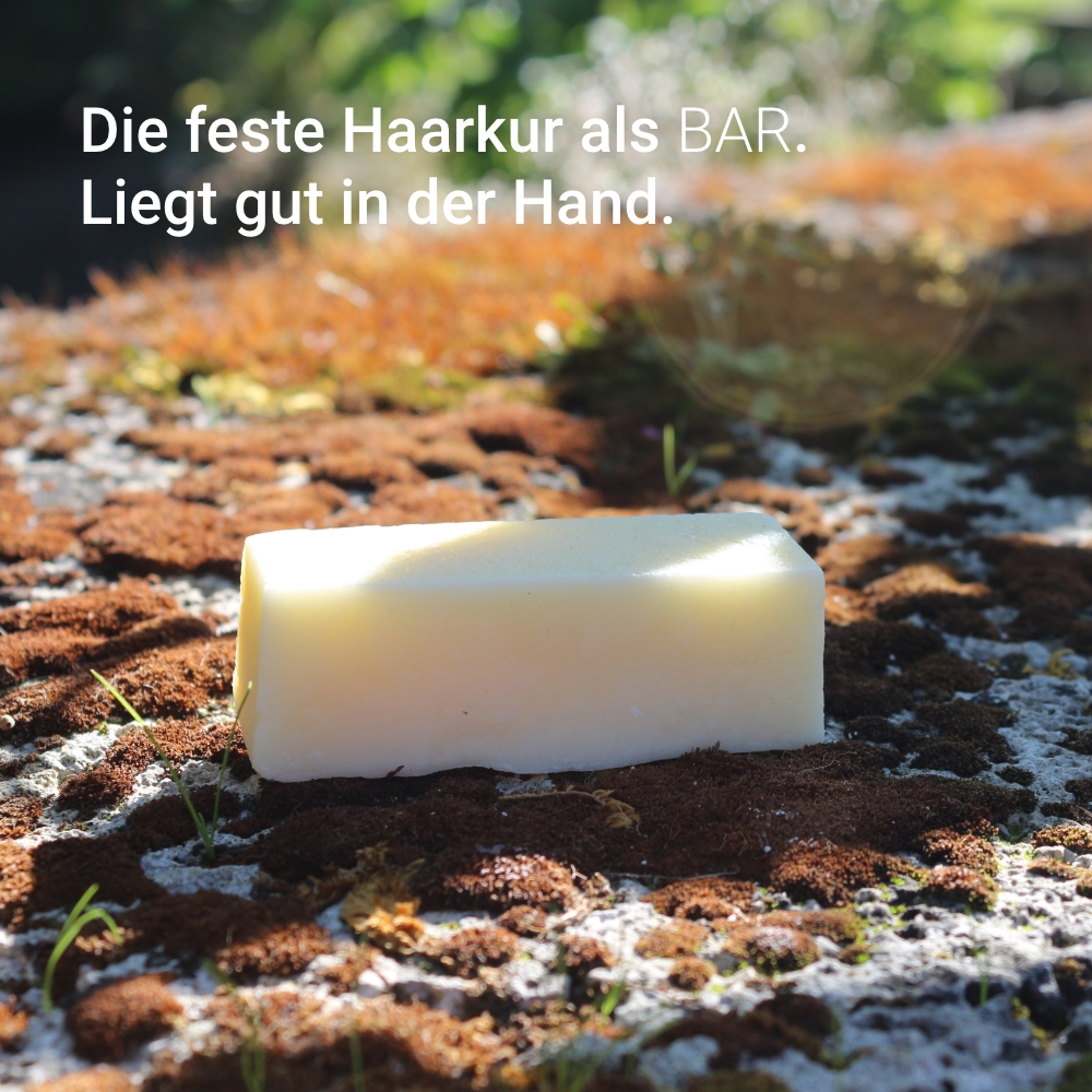 Die feste Form unserer Haarkur macht die Anwendung kinderleicht. Halte die Kur kurz unter warmes Wasser, reibe sie in den Händen oder trage sie direkt auf die Haarlängen auf. Einwirken lassen und danach gründlich ausspülen.